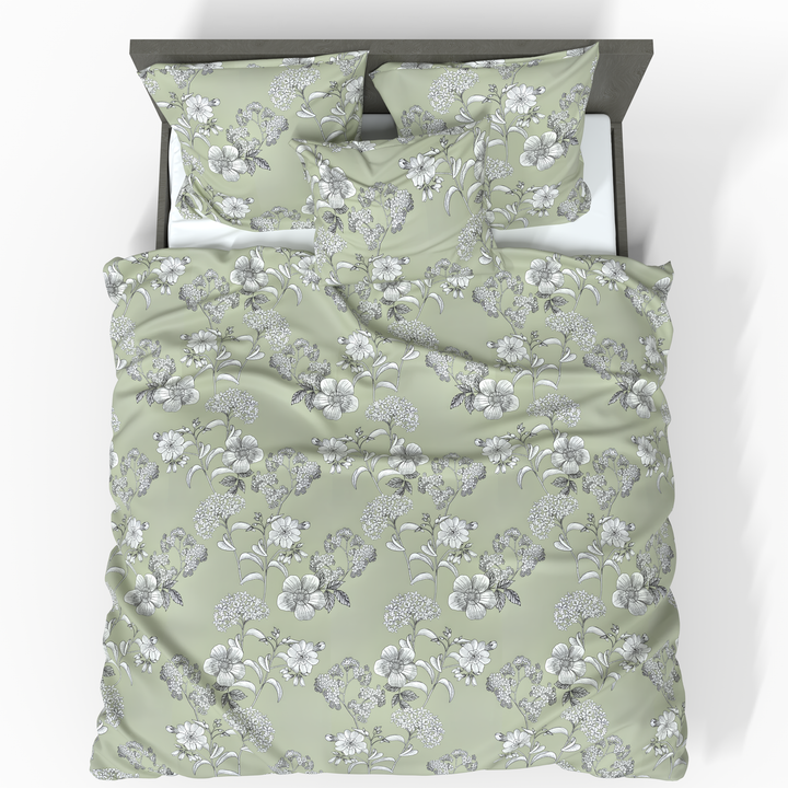 🌿 „Geneva“ – ein Bettdeckenbezug mit botanischem Muster, der aus natürlicher Sanftheit schöpft. Der pistaziengrüne Hintergrund und die linearen Blumen verleihen dem Interieur Ästhetik, Reinheit und Ruhe.