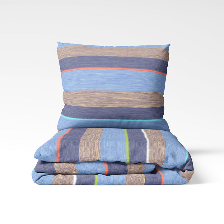 🌊 Coastal Vibes – an energizing and refreshing design inspired by the mood of the seaside. Sky blues, sandy, coral, and green horizontal stripes evoke a sunny summer day by the shore. This design brings colors, vitality, and a sense of freedom to every bedroom.