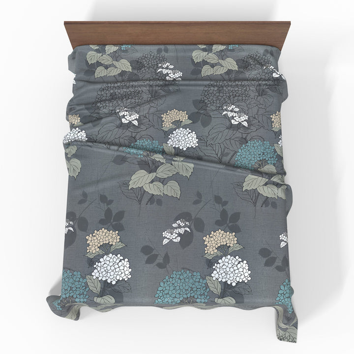 🌸 „Kraków“ – paklodė be gumos, alsuojanti romantika ir šiluma. Giliai pilkas fonas su subtiliai žydinčiais hortenzijų motyvais suteikia elegancijos ir jaukumo kiekvienam miegamajam.